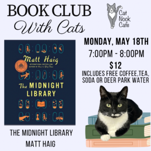 What to Expect: Enjoy a casual book discussion of our book of the month while cuddling with adoptable cats. This event is 1 hour long.